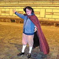 Veschmitzt den Fremden anschauend beendet der Nachtwächter seine Vorstellung von August dem Starken und auf den Fremden zeigend bemerkt er: