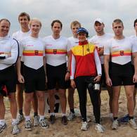 Die Krefelder Marc Benger, Dirk Marterer, Thorsten Hütz, Lars Henning, Moritz Koch, Jochen Urban, Matthias Simons, Larus Melka und Steuermann Stefan Lier freuten sich über die Germanwings Flug-Gutscheine, die ihnen Wilfried Botz, Vorsitzender des Kölner Rudervereins von 1877 bei der Siegerehrung am Kölner Ruderverein von 1877 überreichte.