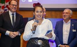 Düsseldorfs Oberbürgermeister Dr. Stephan Keller überreicht den Preis an Dominique Lesser im Plenarsaal des Rathauses